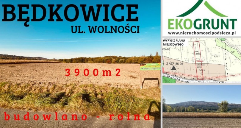Działka budowlano-rolna łącznie o powierzchni 3900m2 położona w Będkowicach gm. Sobótka przy ul. Wolności.