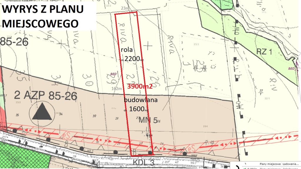 Cześć frontowa działki położona przy drodze gminnej asfaltowej ul. Wolności w planie miejscowym pod zabudowę mieszkaniową MN5- ok. 1600m2.